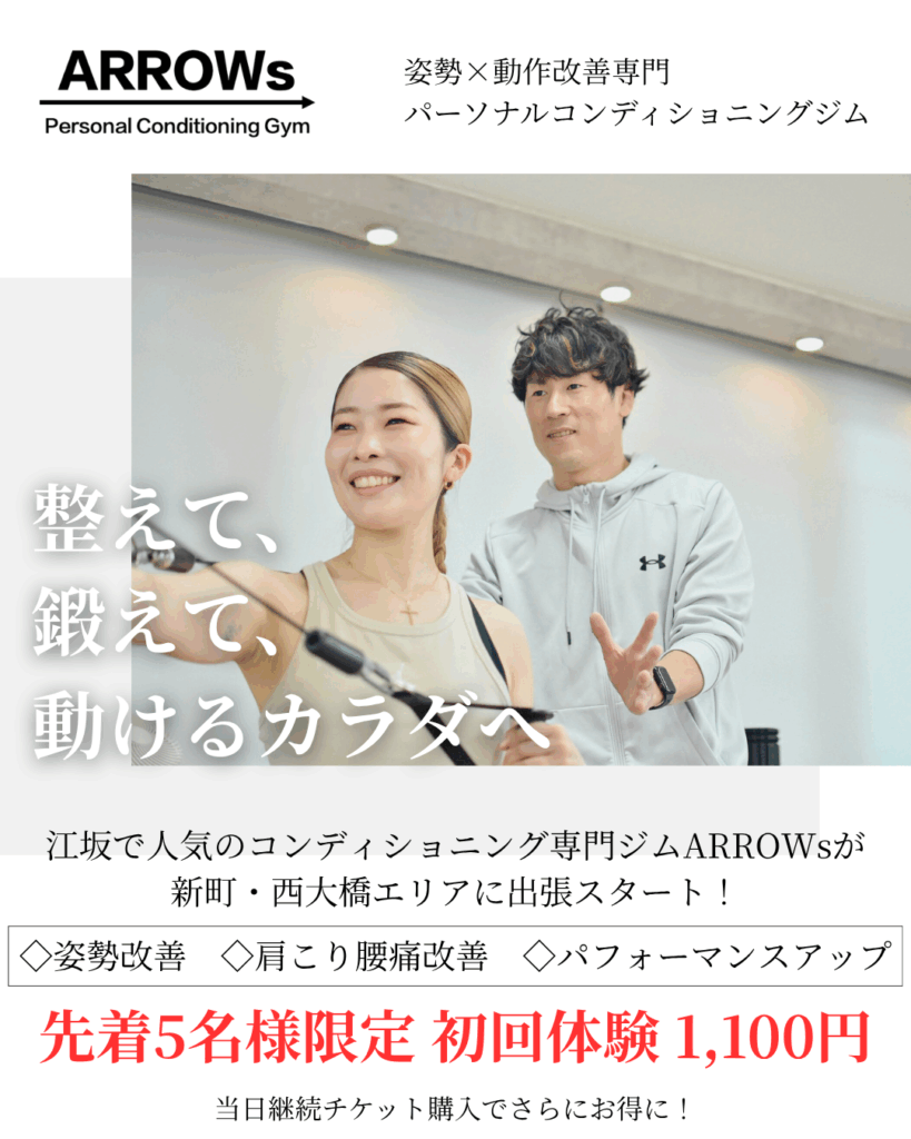 江坂で6年以上の実績をもつパーソナルコンディショニングジムARROWsが、新町・西大橋にて出張パーソナルトレーニングを開始します!!